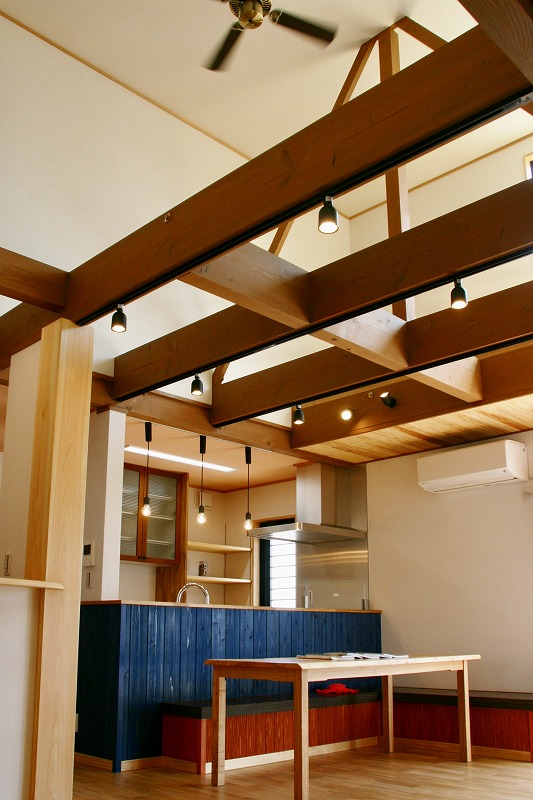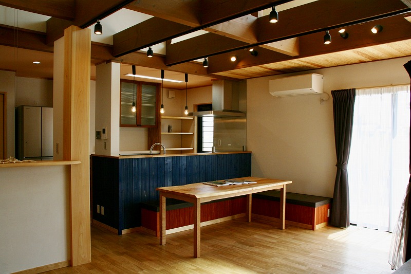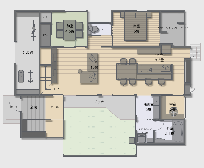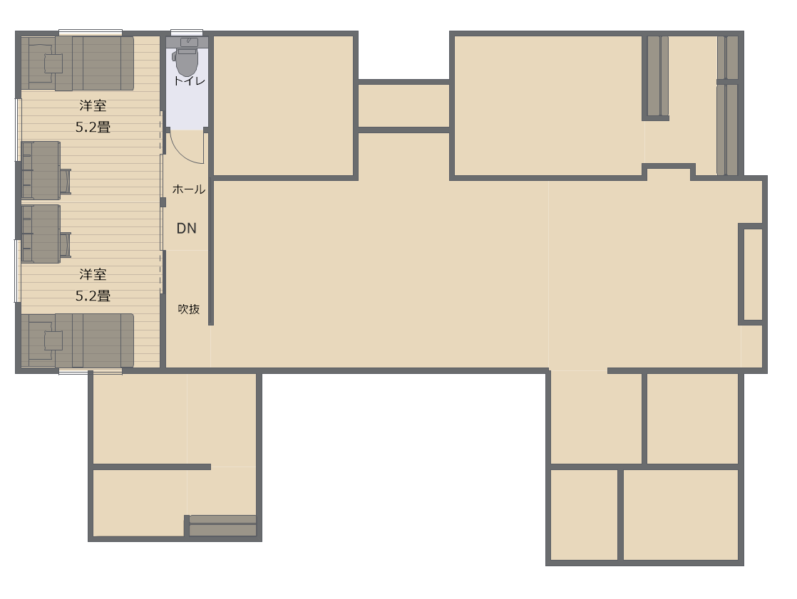 HARERU Okayama 穏やかな海のように、やさしく、明るく。 珊瑚の塗り壁と、力強い大黒柱。 自然素材に包まれた、あたたかな空間。 ネイビーのアクセントと、 岡山デニムの質感が 瀬戸内の海をそっと感じさせる。 時を重ねるほどに味わいを深める、 岡山の住まい。 平面図