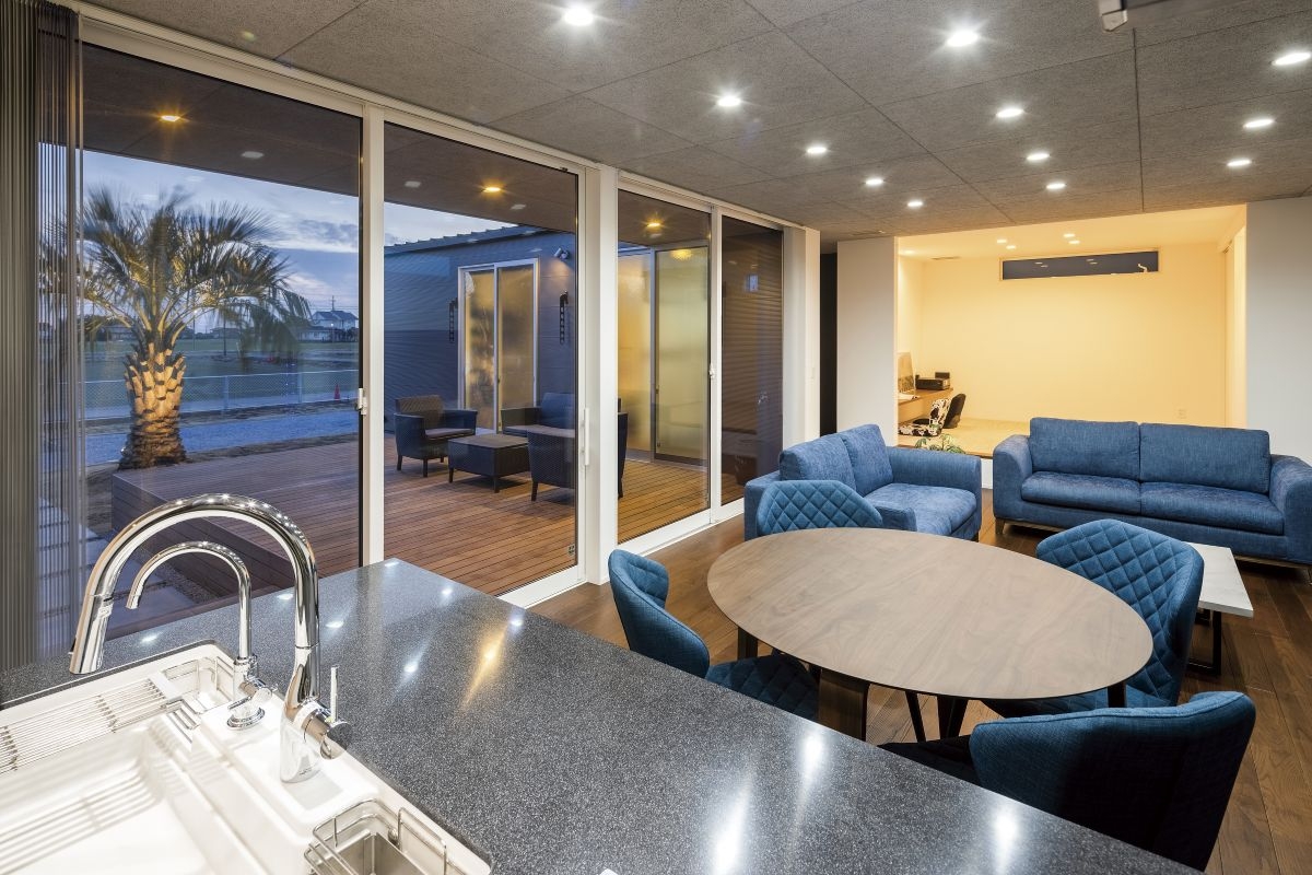 素材が光るコの字型の平屋